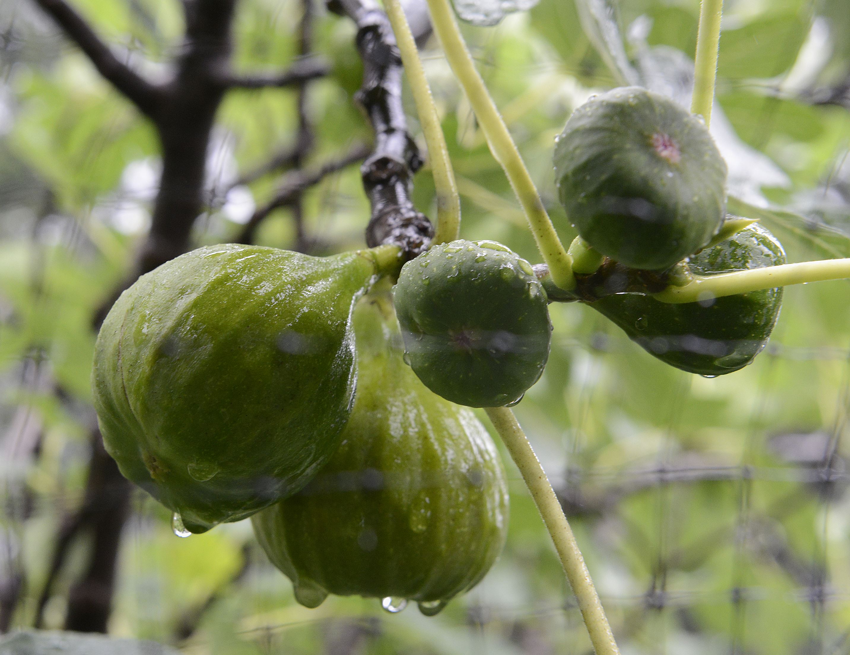 To protect the ripening fruit, he draped netting over the small trees on which large green first figs hung next to smaller ones that will ripen in September. His wife had tried a different approach, wrapping individual figs with scraps of cloth to hide them.